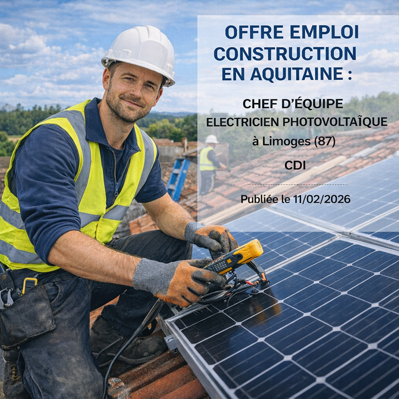 Offre emploi construction en aquitaine : CHEF D’EQUIPE ELECTRICIEN PHOTOVOLTAÏQUE à Limoges (87)