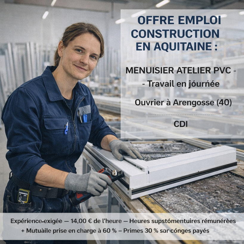 Offre emploi construction en aquitaine MESUISIER ATELIER PVC – Travail en journée Ouvrier à Arengosse (40) CDI