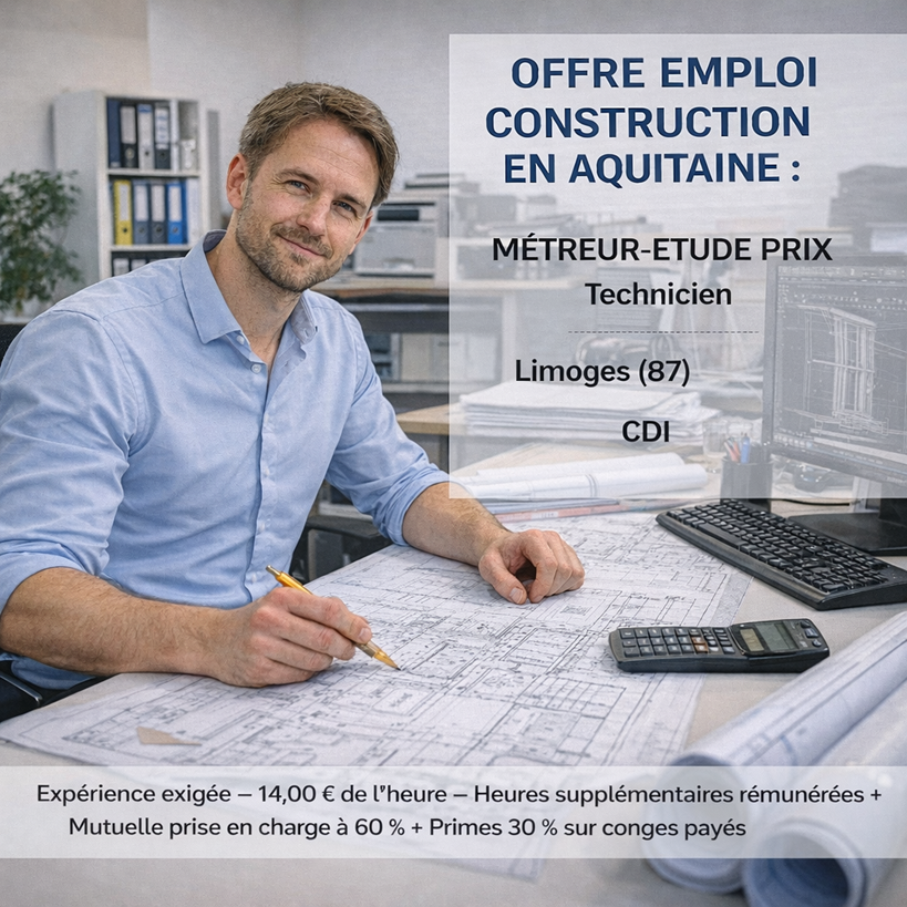 Offre emploi construction en aquitaine : METREUR-ETUDE PRIX Technicien Limoges (87) CDI