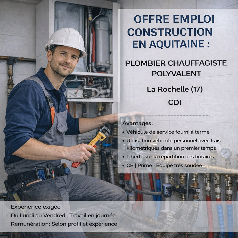 Offre emploi construction en Aquitaine : Plombier chauffagiste polyvalent La Rochelle (17) CDI Publiée le 21/01/2026…