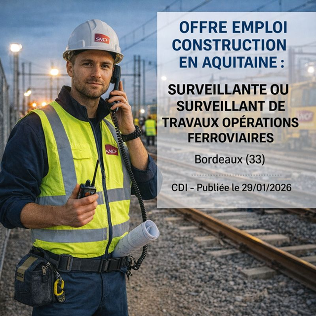 Offre emploi construction en Aquitaine : Surveillante ou Surveillant de travaux opérations ferroviaires Bordeaux (33) CDI…