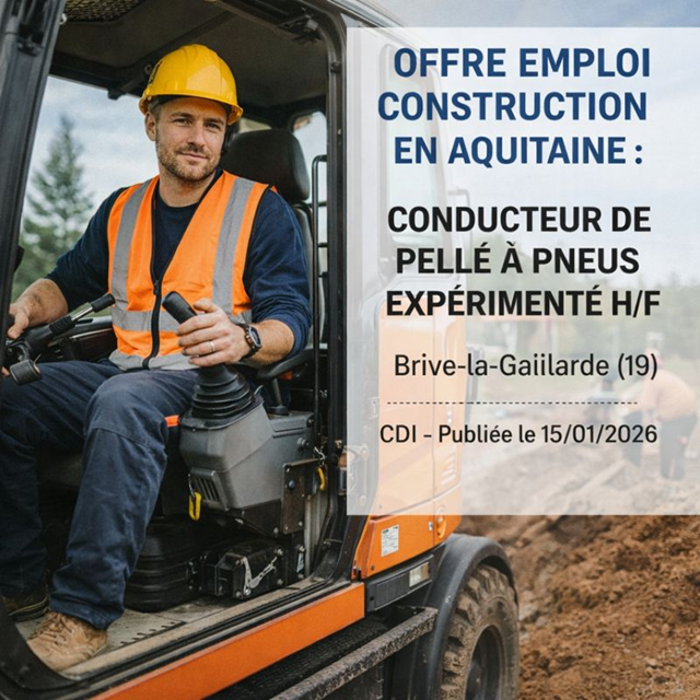 Offre emploi construction en Aquitaine : Conducteur de pelle à pneus expérimenté H/F Brive-la-Gaillarde (19) CDI…