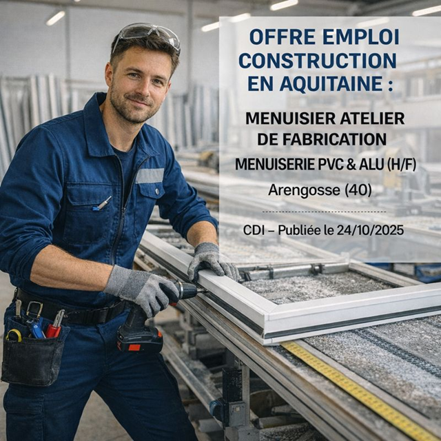 Offre emploi construction en Aquitaine : MENUISIER ATELIER DE FABRICATION MENUISERIE PVC & ALU (H/F) Arengosse…