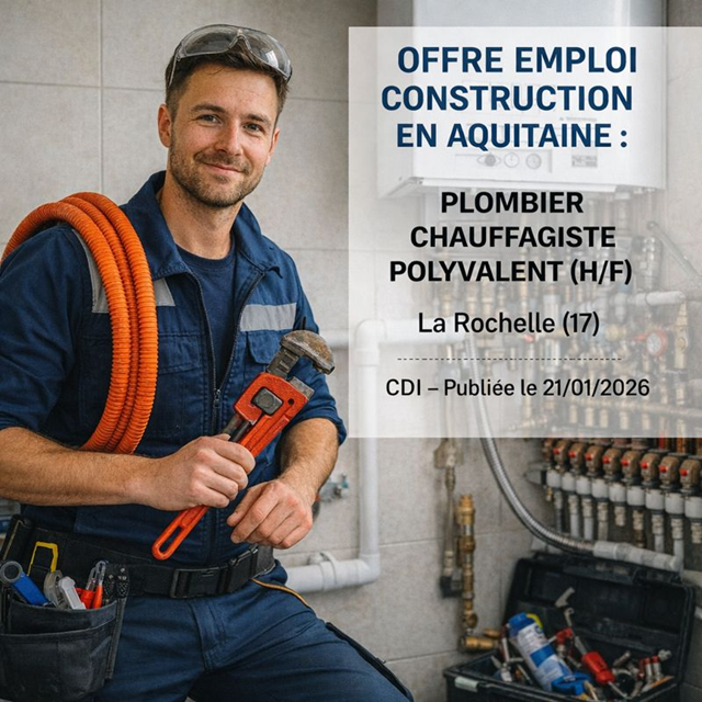 Offre emploi construction en Aquitaine : Plombier chauffagiste polyvalent La Rochelle (17) CDI Publiée le 21/01/2026…