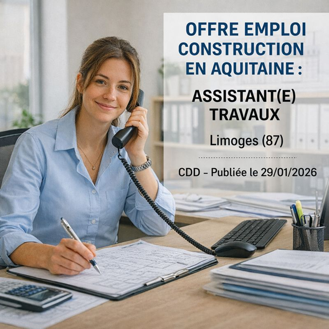 Offre emploi construction en Aquitaine : ASSISTANT(E) TRAVAUX Limoges (87) CDD Publiée le 29/01/2026 Description du…