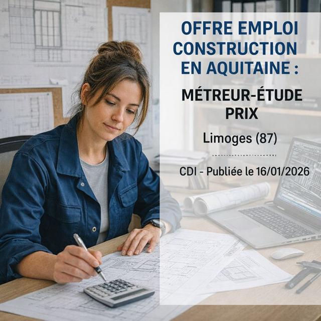 Offre emploi construction en Aquitaine : METREUR-ETUDE PRIX Limoges (87) CDI Publiée le 16/01/2026 Description du…